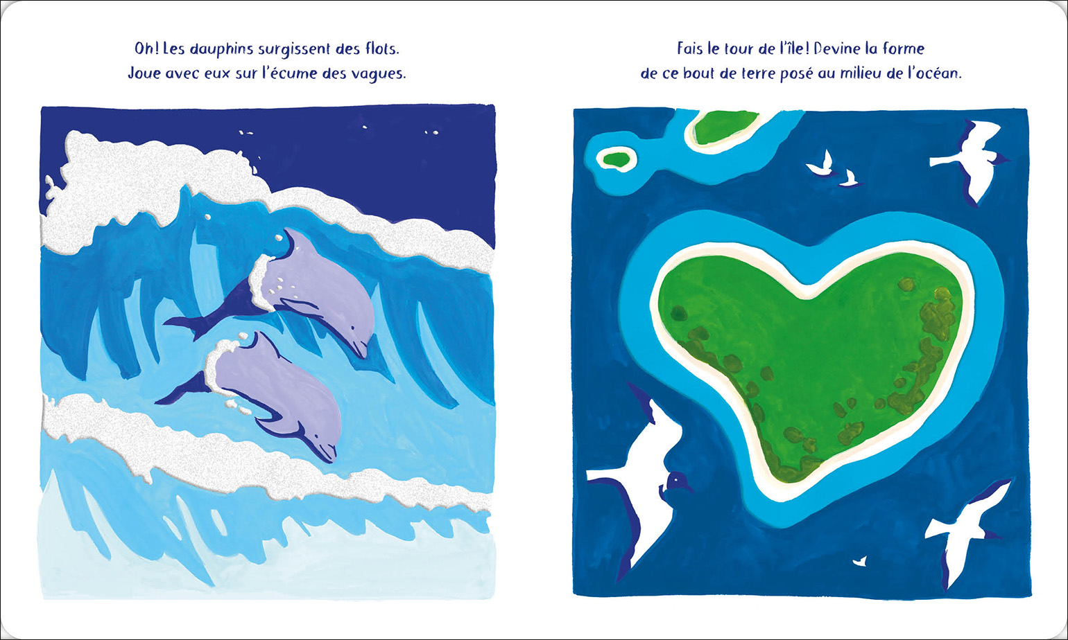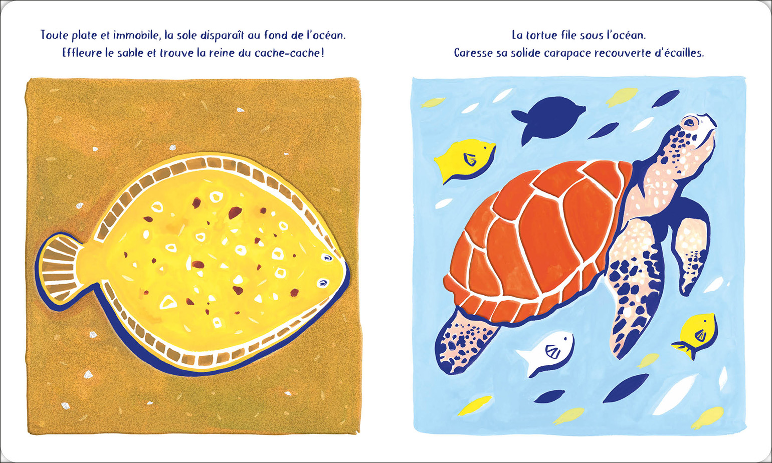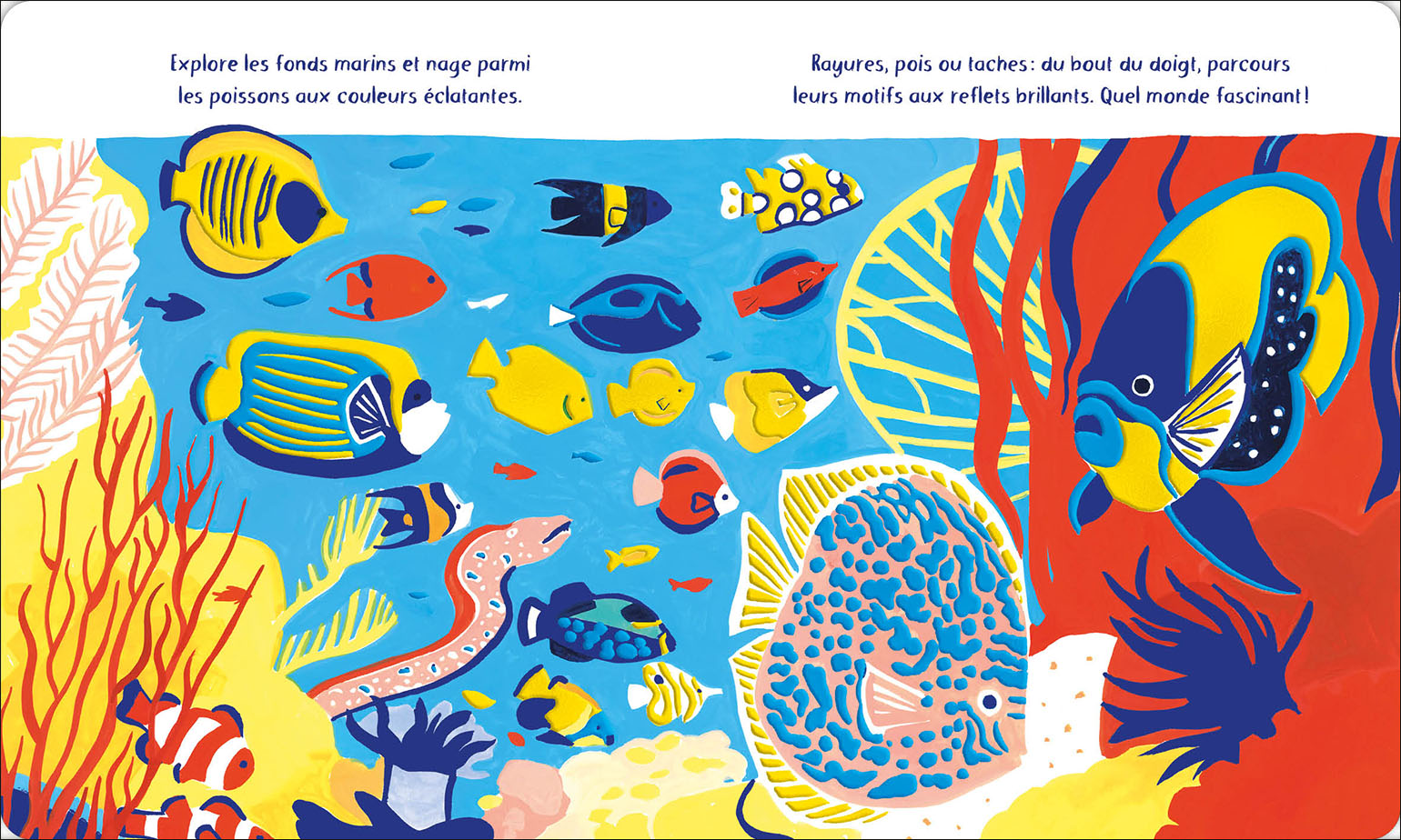 Suivre le vol des poissons volants, effleurer les piquants du poisson porc-épic, passer la main sur le sable pour trouver la sole cachée… À chaque page, une surface à toucher différente invite l’enfant à une exploration sensorielle ! Idéal pour développer le sens tactile des plus petits, la précision du geste et l’acquisition du vocabulaire par le « faire ».