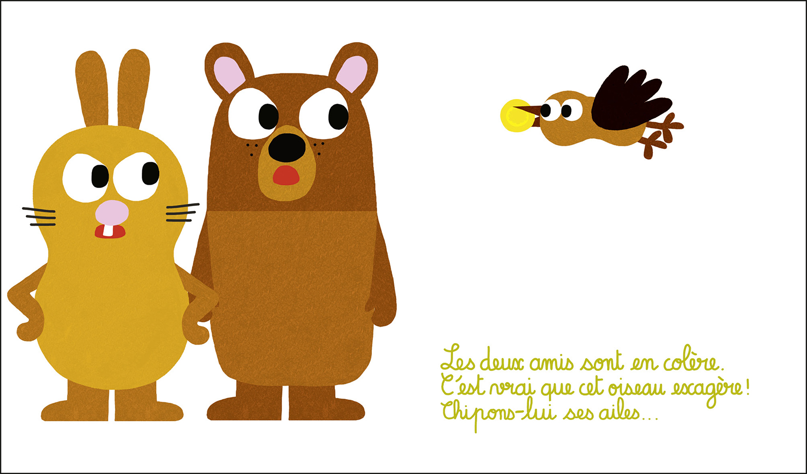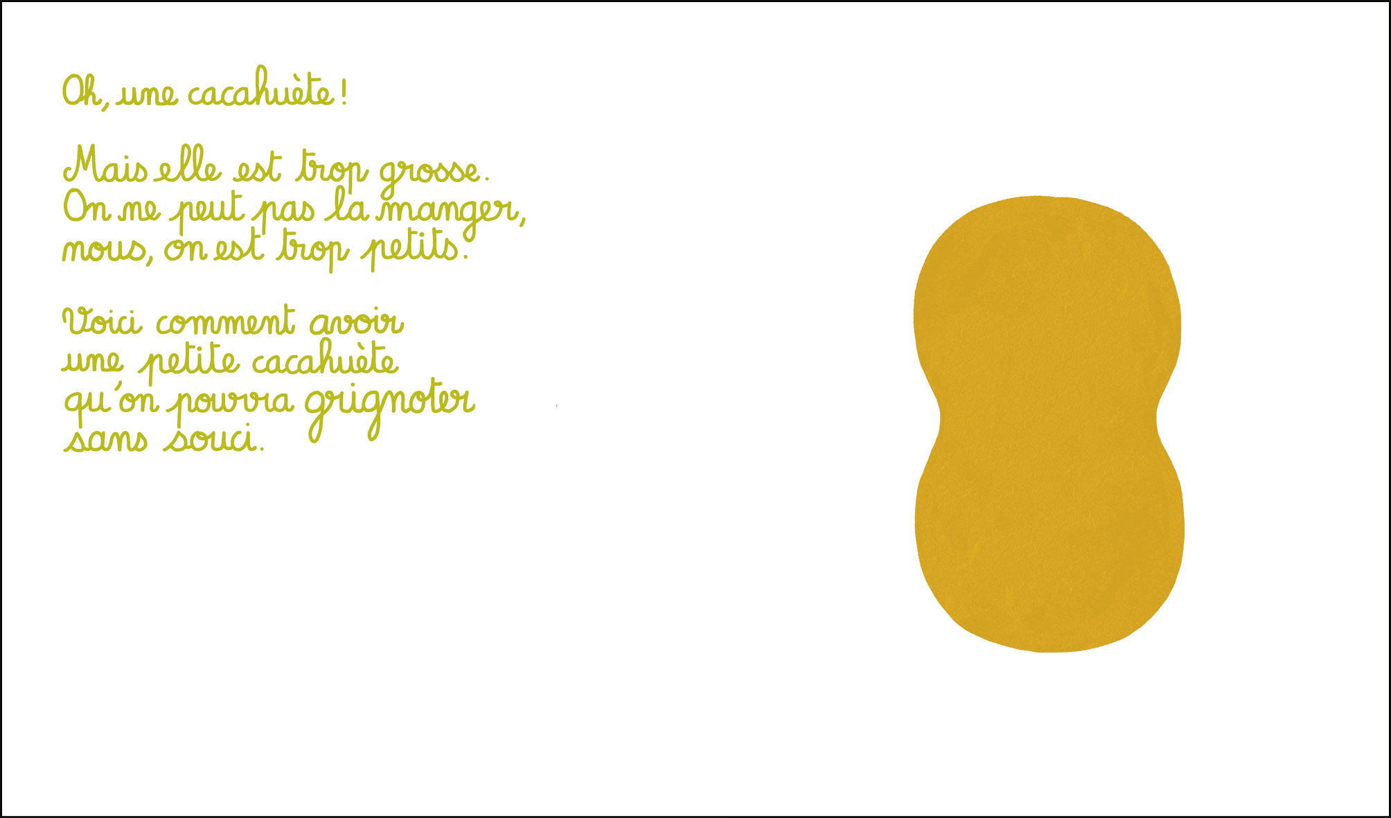En quelques coups de crayons et beaucoup d’imagination, comment changer une trop grande cacahuète en petite cacahuète à croquer ? Quand l’art de la narration joue avec la magie du dessin nait un grand album d’humour !